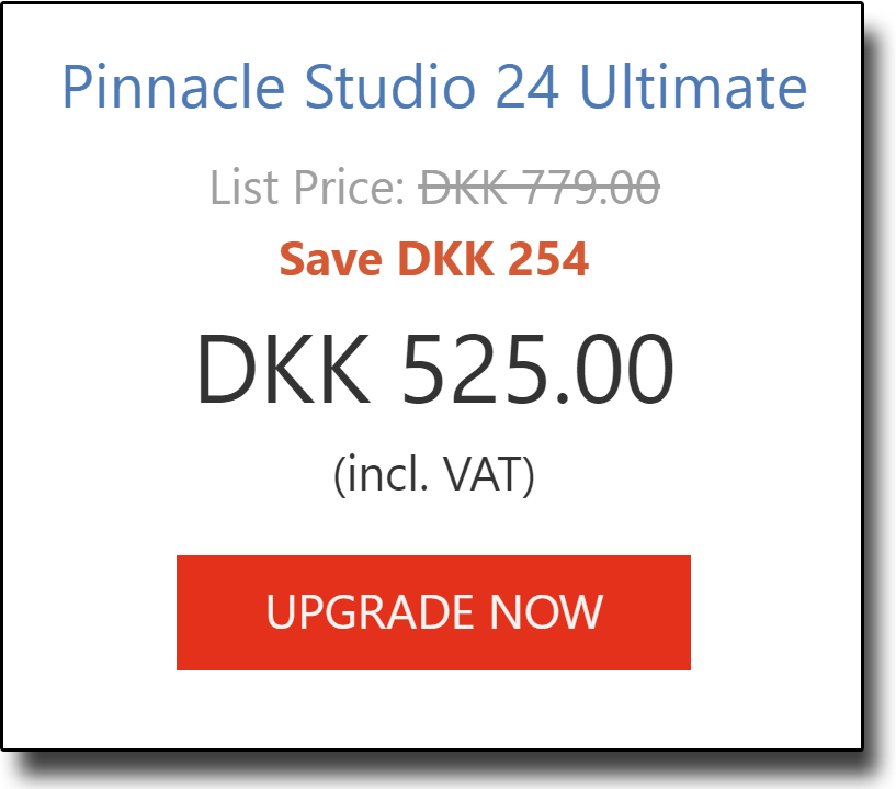 Tilbud på opgradering med rabat. Mulighed for at indkøbe, downloade og installere Pinnacle Studio Ultimate 24. Det er den seneste udgave af det dansksprogede videoredigeringsprogram, som adskillige medlemmer allerede har. Du kan opgradere med rabat, hvis du har Pinnacle fra version 9 til 23.